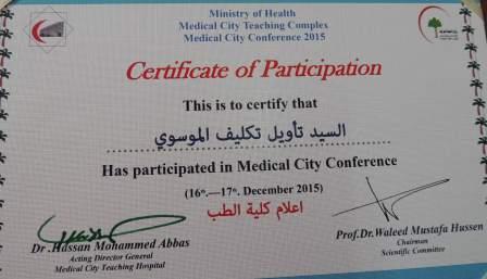 كرم المسؤول الإعلامي لكلية طب بغداد بشهادة تقديرية من دائرة مدينة الطب التعليمية وذلك لمشاركته في المؤتمر العلمي السنوي العالمي لعام 2015 التي اقامتها مدينة الطب على قاعة الشهيد درب الموسوي تثميناً لجهودة المبذولة في التغطية الاعلامية والنشر والاعلان عن المؤتمر عبر وسائل الاعلام المقروءة والمسموعة والمحطات الفضائية.