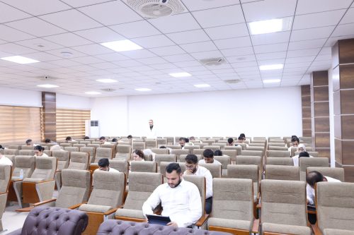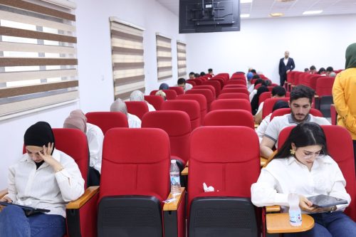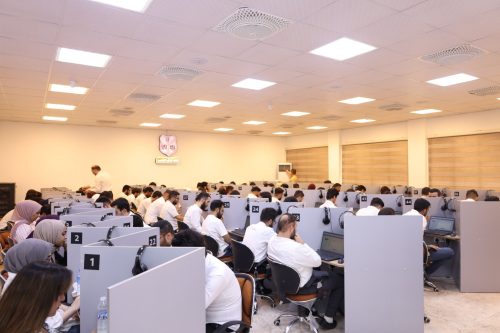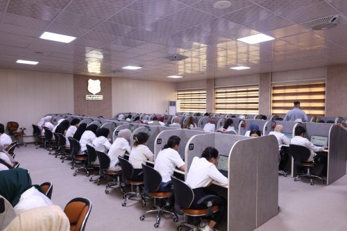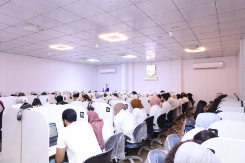 وتم إجراء الامتحان في القاعات الدراسية الذكية للكلية المجهزة ب (700) حاسبة وغرفة سيطرة كاملة للإشراف على مجريات الامتحان.