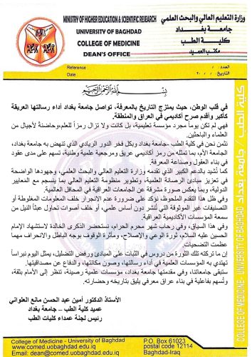 نثمن نحن في كلية الطب -جامعة بغداد وبكل فخر الدور الريادي الذي تنهض به جامعة بغداد، الجامعة الأم، بما تمثله من رمز أكاديمي عريق ومرجعية علمية وطنية، تسهم على مدى عقود في بناء العقول وصناعة المعرفة.